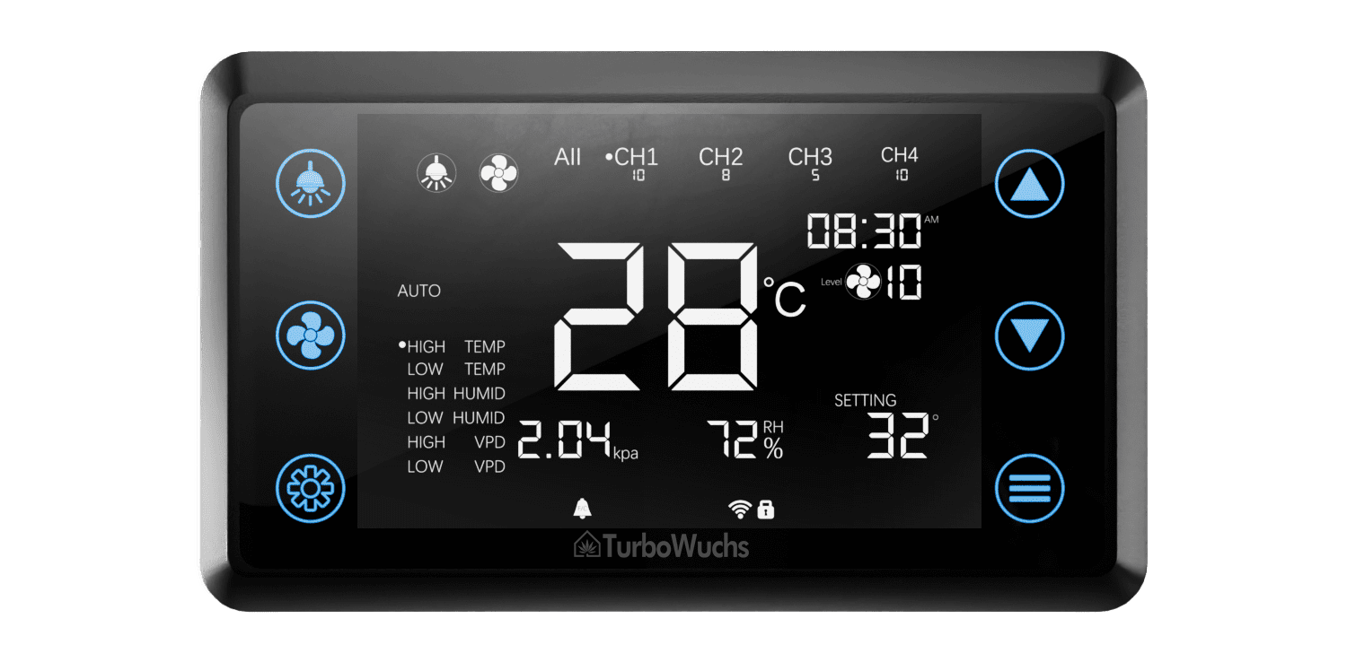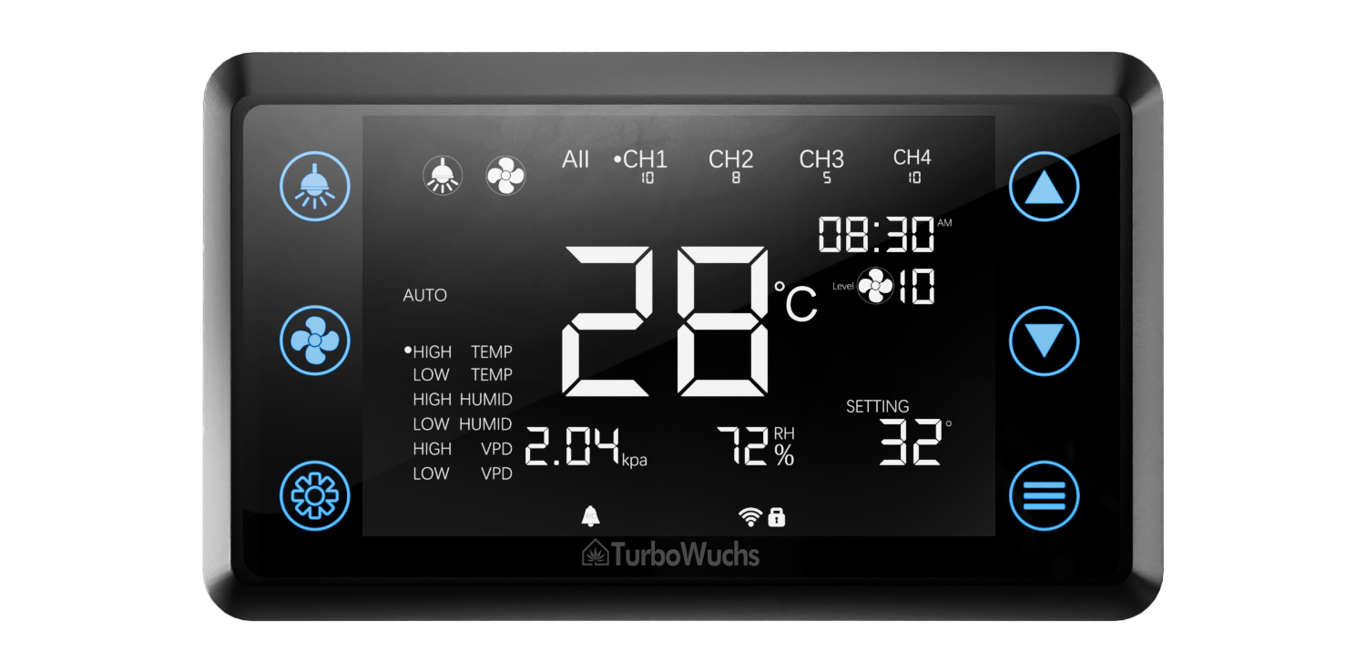 Intelligente Klimasteuerung – Der Controller passt automatisch die Belüftung, Temperatur und Luftfeuchtigkeit (VPD) an, um ideale Wachstumsbedingungen zu schaffen.