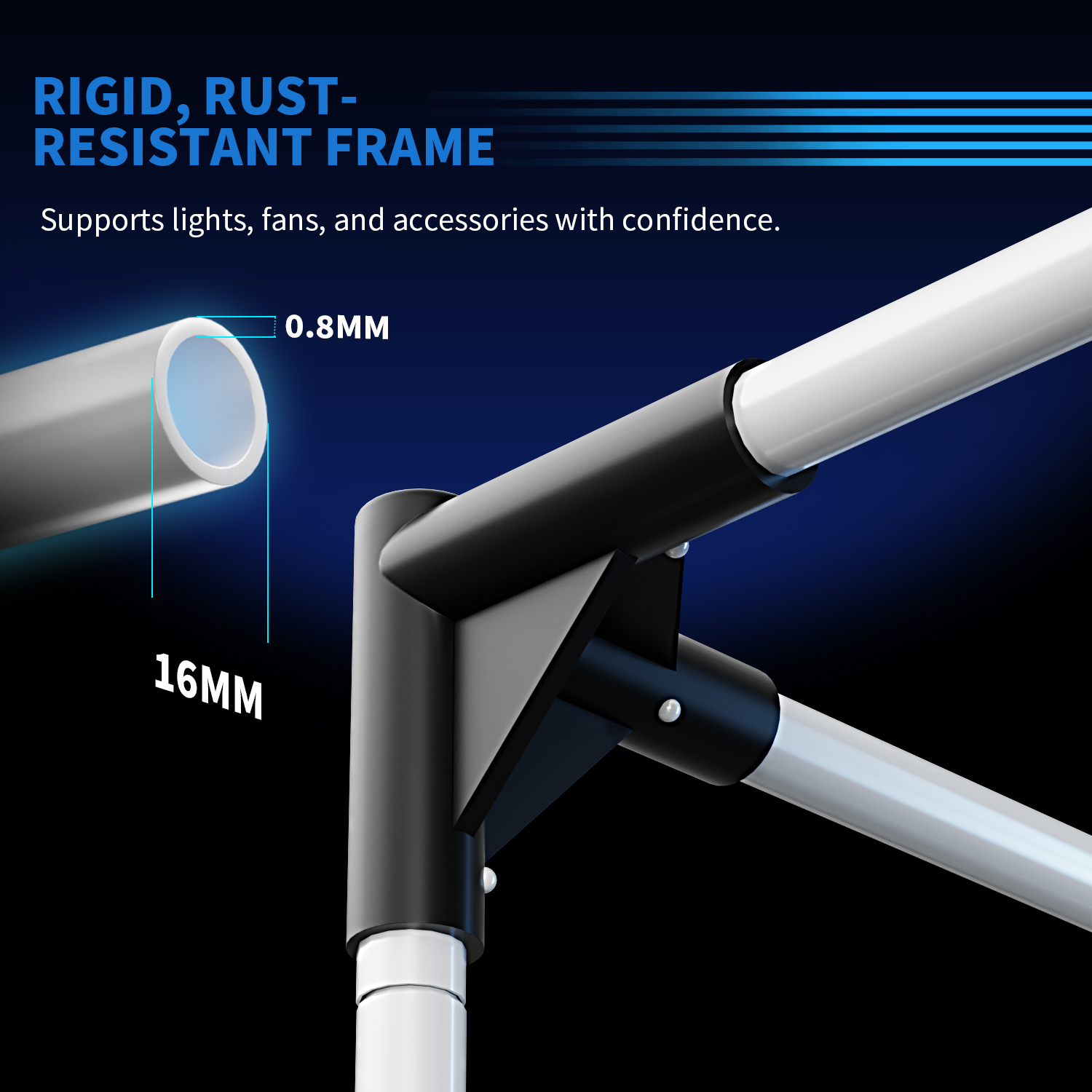 Sturdy Frame: The grow tent features a robust, rust-resistant metal frame that supports the weight of heavy equipment such as lights, fans, and other accessories.