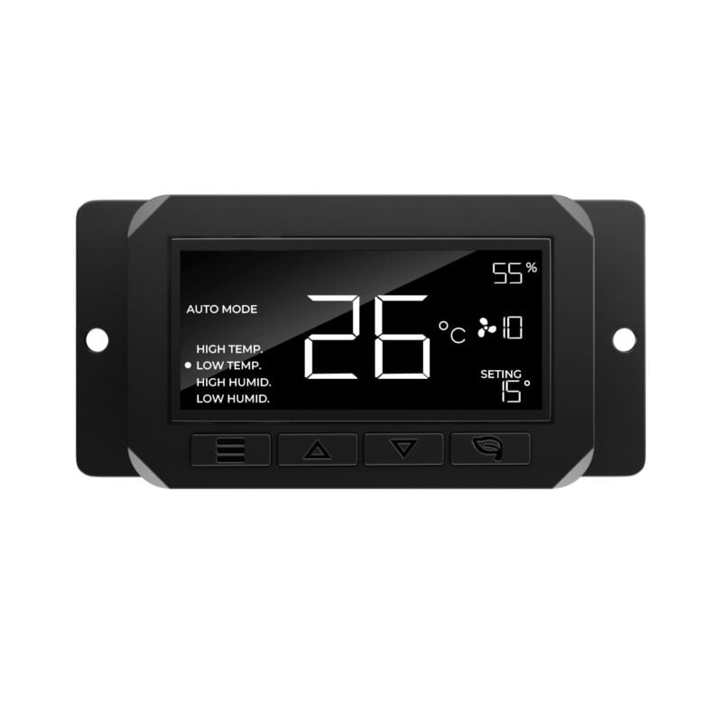 Klimacontroller: Digitale Klimasteuerungen überwachen kontinuierlich Temperatur, Luftfeuchtigkeit, CO₂ und Unterdruck. Sie passen die Lüfterdrehzahl automatisch an, um ein voreingestelltes Klima zu erreichen. So kannst du etwa einstellen, dass bei 28 °C und 70 % Luftfeuchte der Ventilator eine höhere Stufe einlegt, bis die Werte wieder im gewünschten Bereich sind. Moderne Controller bieten oft auch Zeitpläne, „Sonnenauf-/untergang“-Funktion und Datenspeicherung.
