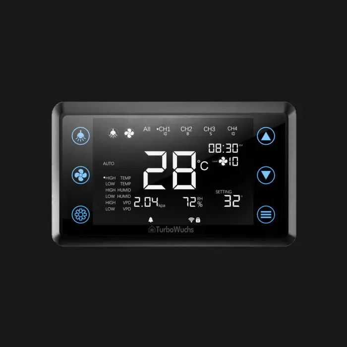 Dieser Controller ermöglicht die präzise Steuerung und Anpassung der Lüftergeschwindigkeit. Er bietet Funktionen wie Zeitsteuerung, Zyklusbetrieb und Plansteuerung. Der Lüfter kann automatisch an die Umgebungsbedingungen angepasst werden, basierend auf Temperatur, Luftfeuchtigkeit und VPD (Dampfdrückedefizit). Dies sorgt dafür, dass die Klimabedingungen im Growzelt konstant innerhalb der gewünschten Parameter bleiben. Mit intelligenter Regelung sorgt der Controller dafür, dass die optimalen Wachstumsbedingungen für Pflanzen jederzeit gewährleistet sind.